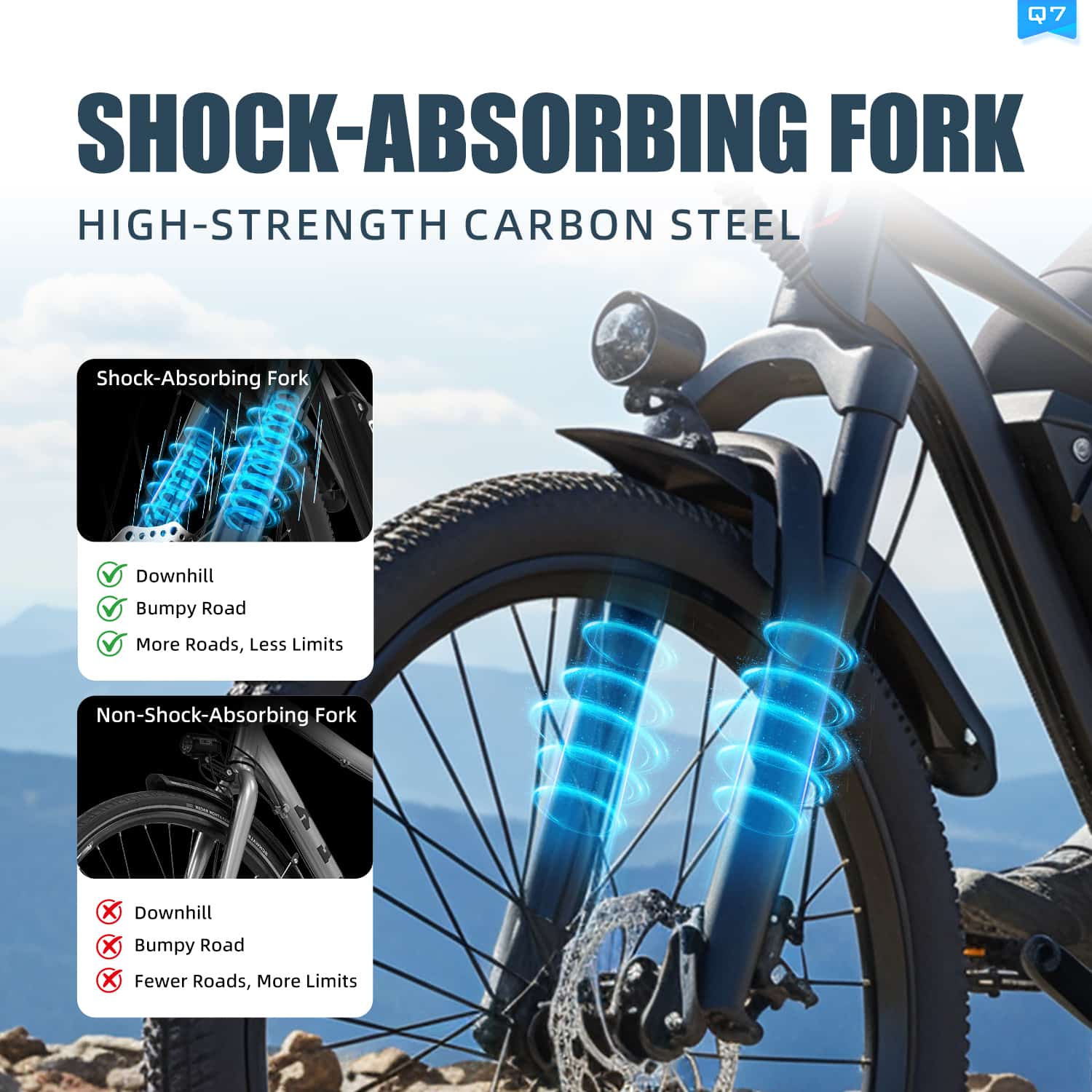 A maximális kényelem érdekében az AAIRSK Q7 első dual lengéscsillapítóval lett ellátva, amely hatékonyan nyeli el az úthibák okozta ütődéseket. Legyen szó kátyúkról, fekvőrendőrökről vagy macskaköves utcákról, ez a felfüggesztés kisimítja az utat Ön előtt. A dual kialakítás stabilabbá teszi az első kereket, javítva a kormányozhatóságot és csökkentve a karok elfáradását. Ez a prémium kényelmi funkció teszi lehetővé, hogy hosszabb távokat is pihentetően tegyen meg. Élvezze a komfortos haladást, bárhová is vezessen az útja!
