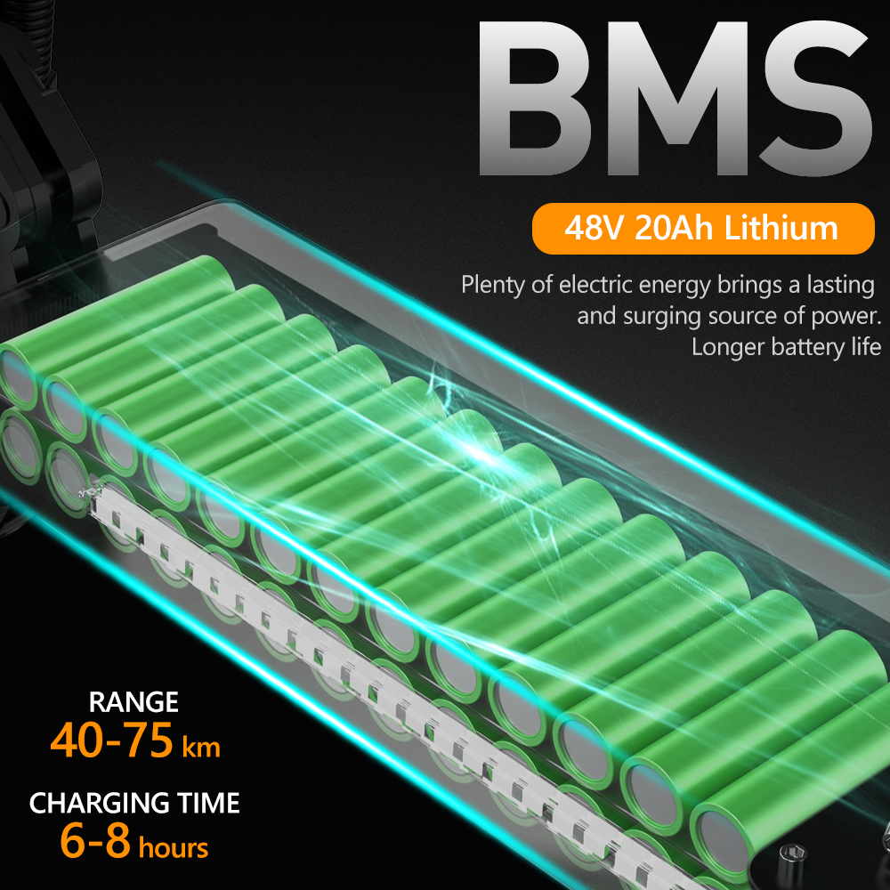 - Nagy Kapacitású Akkumulátor: A 48V, 20AH akkumulátor hosszú utazásokat tesz lehetővé egyetlen töltéssel. A gyári adatok szerint akár 60-70 km-t is megtehet, ami ideális a hosszabb ingázásokhoz vagy kirándulásokhoz.