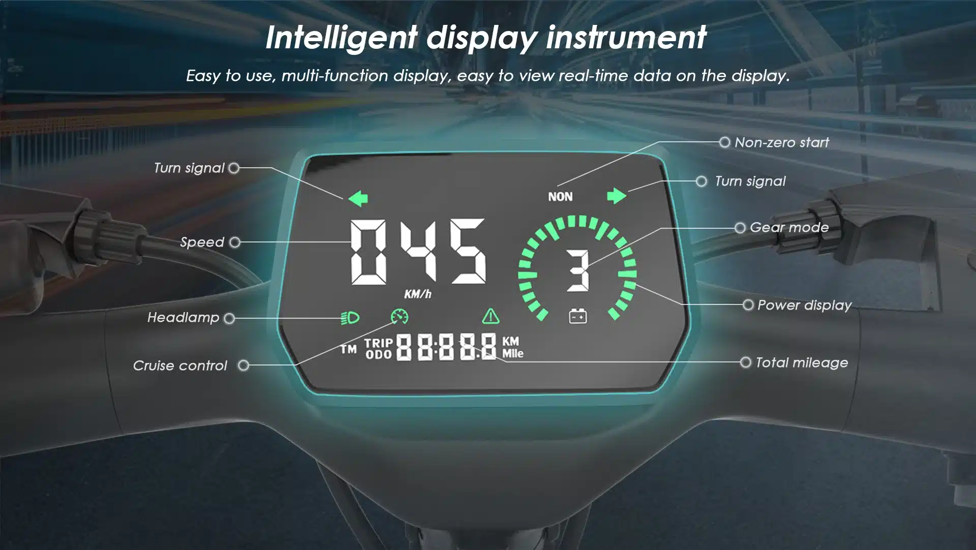 A kormányon helyet kapott nagyfelbontású LCD kijelző minden fontos információt azonnal közvetít a vezető számára. Egyetlen pillantással leolvashatja az aktuális sebességet, az akkumulátor töltöttségi szintjét és a megtett kilométereket is. A kijelző háttérvilágítása lehetővé teszi, hogy közvetlen napsütésben vagy éjszaka is tökéletesen olvasható maradjon az összes adat. Az intuitív kezelőfelületen keresztül egyszerűen válthat a sebességi módok között vagy kapcsolhatja fel a világítást, így figyelme mindig az úton maradhat.