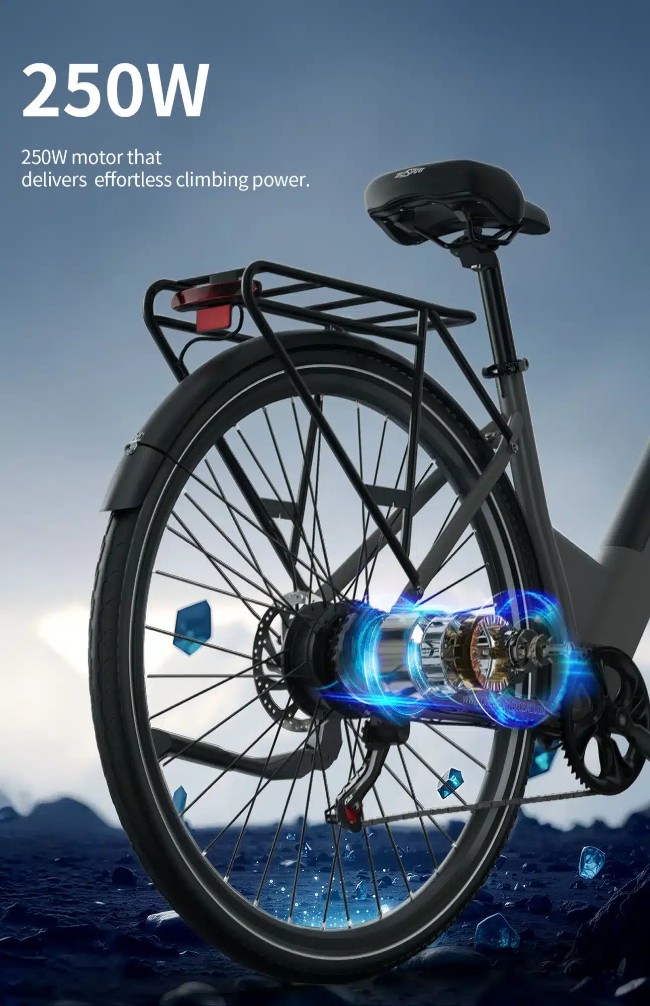 A kerékpár hátsó agymotoros meghajtással rendelkezik, ami közvetlen és természetes hajtásélményt biztosít minden elindulásnál. Mivel a motor közvetlenül a hátsó kereket forgatja, a nyomatékátvitel veszteségmentes és azonnali, ami stabil úttartást eredményez. Ez a kialakítás kevesebb karbantartást igényel, mint a középmotoros rendszerek, és kíméli a láncot, illetve a váltót is. A hátsó kerékbe integrált motor javítja a tapadást, különösen csúszósabb útfelületen, így növelve a biztonságot. Ez a technikai megoldás a legnépszerűbb választás a modern városi e-bike-ok körében a hatékonysága miatt.