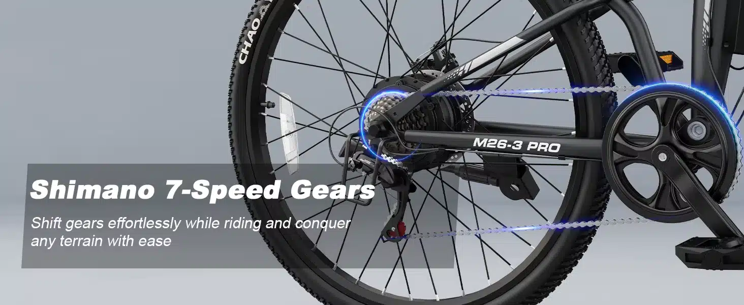 A kerékpár a világszerte elismert Shimano 7 sebességes váltórendszerével van felszerelve, amely precíz és gyors váltást tesz lehetővé. A hét különböző fokozat segítségével mindig megtalálja az ideális áttételt a meredek emelkedőkhöz vagy a gyors sík szakaszokhoz. A váltórendszer zökkenőmentesen dolgozik együtt az elektromos rásegítéssel, maximalizálva a hajtás hatékonyságát. A Shimano alkatrészek tartóssága és megbízhatósága garancia a gondtalan használatra hosszú távon is. Uralja a terepet és a tempót ezzel a professzionális váltóművel!